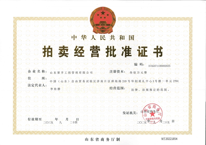 近日,山东聚孚工程管理有限公司正式取得拍卖业务经营许可证,标志着公司在多元化服务领域实现重要突破,综合实力迈上新台阶。